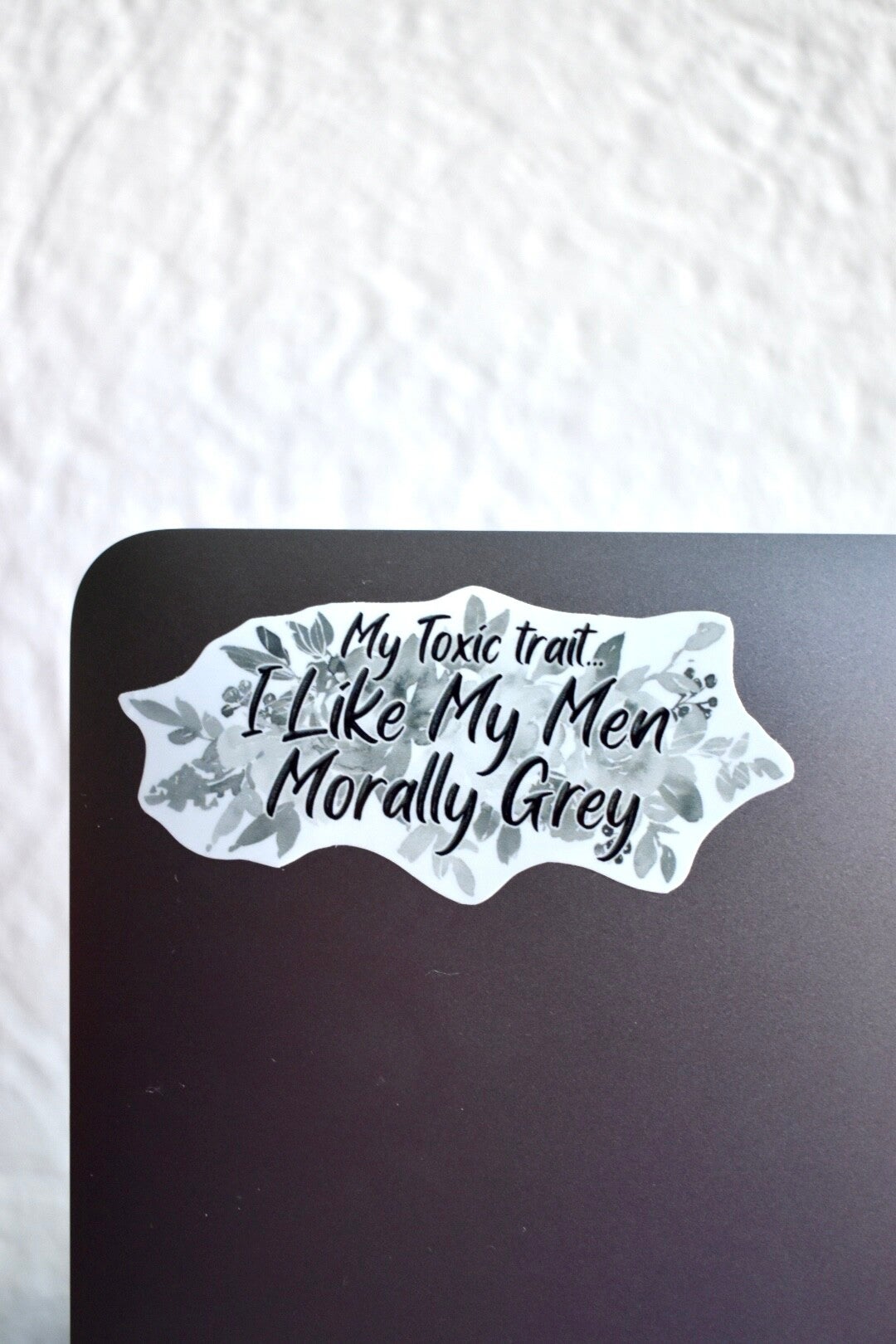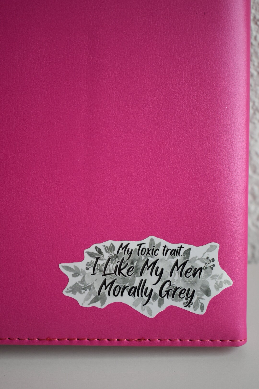 Deze sticker met de tekst “My toxic trait… I like my men morally grey” is dé guilty pleasure accessoire voor elke romance- en fantasyfan. Plak hem op je waterfles, laptop of journal en laat iedereen weten dat jouw type man niet zwart of wit is, maar heerlijk… grijs. Perfect voor lezers die vallen voor de charmes van duistere anti-helden.