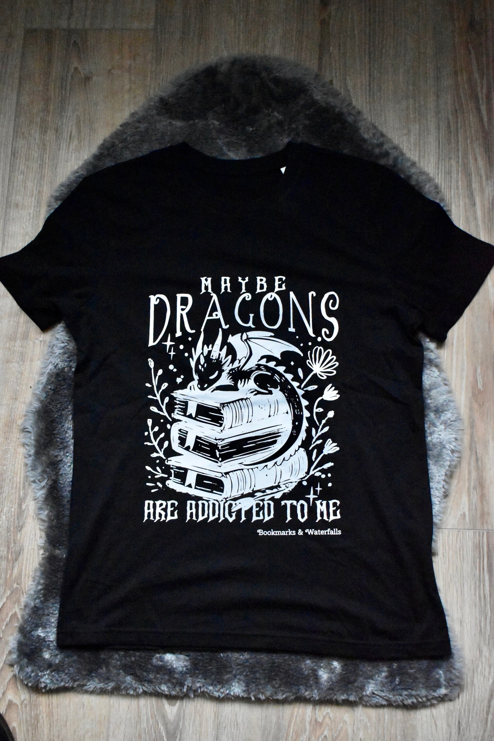 Laat je fantasy of drakenrijders heart spreken met dit T-shirt met de tekst “Maybe dragons are addicted to me”. Perfect voor lezers die graag verdwalen in magische werelden vol draken, helden en een vleugje humor.